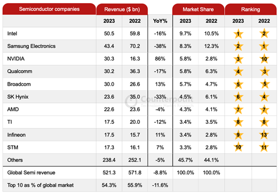 意法半导体也得益于其汽车产品和分立器件产品业务的持续增长,2023年营收为173亿美元,同比增长7%,市场份额也提升到了3.3%,排名第十。