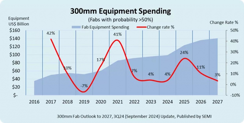 9月26日,国际半导体产业协会(SEMI)发布的最新预测报告指出,预计2024年全球12英寸晶圆厂的设备支出将同步增长4%至993亿美元,2025年将再度增长24%至1232亿美元,在2025-2027年的三年间,12英寸半导体设备的资本支将达到创纪录的4000亿美元,其中以中国大陆,韩国,中国台湾地区支出最多 午夜影院, 。