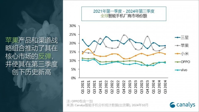 Canalys分析师周乐轩指出:“在渠道和供应链优化战略的推动下,苹果第三季度出货量创下历史新高,在苹果全球开发者大会(WWDC)发布Apple Intelligence以来,消费者积极从旧款iPhone 12和13升级到新机型,以体验这一新技术,此外,苹果多元化的生产布局,特别是在印度的生产,有效缩短了交货周期,加快了预购订单的流程,并通过具有竞争力的价格刺激了本地需求,在印度生产的iPhone 13和15等上一代iPhone机型的补充供应,进一步支持了苹果在欧美运营商渠道的出货量,使其能够夺回中端市场份额,并抓住消费者的换机需求 午夜影院在线观看,然而,需要注意的是,地缘政治的障碍以及Apple Intelligence的延迟推出,可能会对苹果在第四季度的节日季和2025年表现造成一定影响,” 。