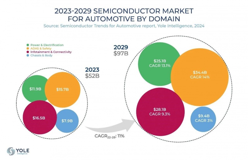 Yole Group近期发布了2024年版的《Semiconductor Trends in Automotive》 午夜影院,该报告显示,2023年至2029年间,汽车半导体市场预期将以11%的年均复合增长率(CAGR)增长,至该时段期末规模可达近1000亿美元, 。