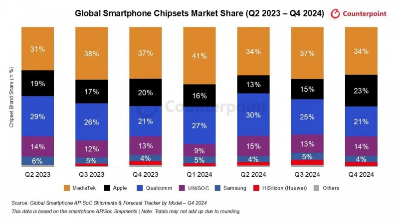3月28日消息,近日市场研究机构Counterpoint Research公布了2024年第四季度全球智能手机AP/SoC市场研究报告,按出货量份额排名,联发科以34%份额位居第一,华为海思以约3%的份额排名第六 午夜影院, 。