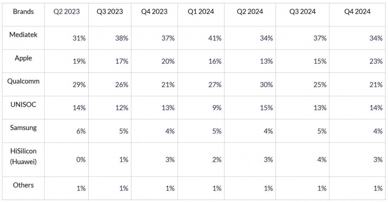 排名第二的是苹果,得益于iPhone新机在2024年四季度的大量出货,推动苹果A系列处理器出货量在该季快速增长,其市场份额也由三季度的15%上升至23%,同比也增长了3个百分点 午夜影视资源, 。