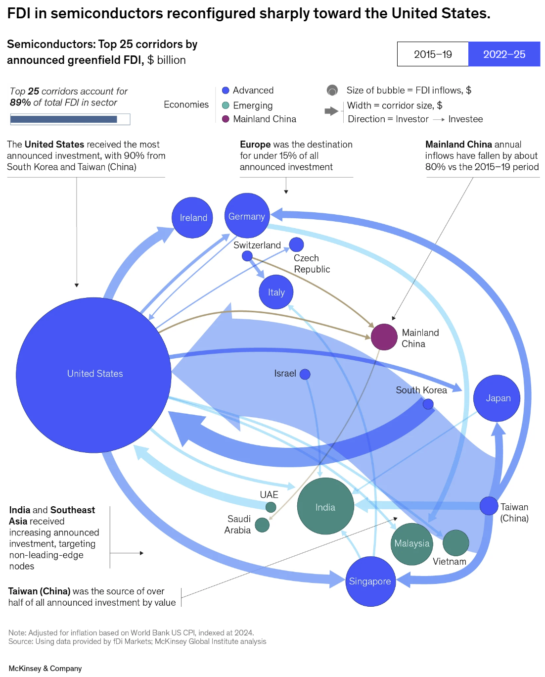 11月27日消息,据麦肯锡最新发布的一份研究报告显示,在美国特朗普政府上台之后,2025年半导体业的外国直接投资(FDI)有近90%流向了美国,且多由中国台湾,韩国企业推动,其中,台积电的投资规模最大,并以在美国建立完整的先进制程供应链为目标,目前台积电亚利桑那州厂已量产4nm技术,并计划扩展至A16制程,此外 午夜影院,三星也在美国德克萨斯州泰勒市扩大先进制程产能,虽然之前经历了多次延宕,但近期已回到正轨,并朝着在美国量产2nm制程迈进,同时也拿下特斯拉AI芯片代工大单, 。