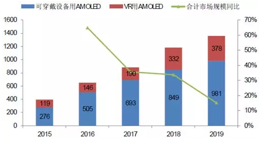 2015-2019可穿戴和VR用AMOLED市场规模趋势预测(单位:百万美元)