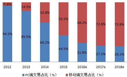 图表4: 2012-2018年中国网络购物交易额PC端和移动端占比(单位:%)