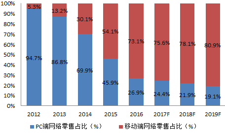 2017-2019年中国网上零售市场移动端交易规模占比(单位:%)