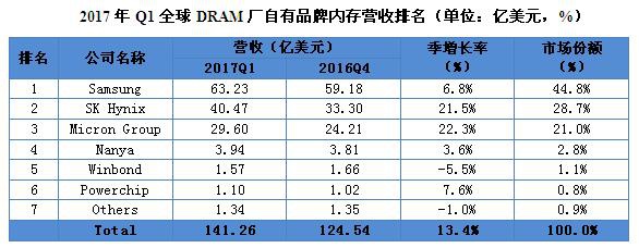 5月18日,集邦咨询半导体研究中心DRAMeXchange发布最新报告,2017年第一季度全球内存营收再创新高。由于2016年第四季度严重供不应求,今年第一季度PC内存合约价再度上涨超过30%,其它类型内存,如手机内存、服务器内存价格也同步上扬。DRAMeXchange表示,第一季度,内存行业总体营收较上季度大涨13,4%。 午夜影院。