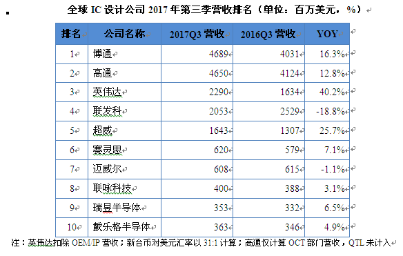 根据拓墣产业研究院最新统计,全球前十大IC设计业者2017年第三季营收排名与第二季排名一致,前三名依次为博通、高通、英伟达。其中,联发科第三季的营收与毛利率表现虽趋近财测高标,但相较于2016年同期,营收仍下滑18 午夜影院,8%,是前十大IC设计公司中唯一连续两个季度衰退幅度达两位数公司。 。
