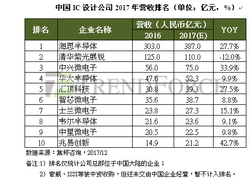 根据集邦咨询预估的2017年IC设计产业产值与厂商营收排名 午夜影视资源,2017年前十大IC设计厂商排名相较于2016年的状况略有调整,大唐半导体设计将无缘前十,兆易创新和韦尔半导体凭借优异的营收表现进入营收排行前十名, 。