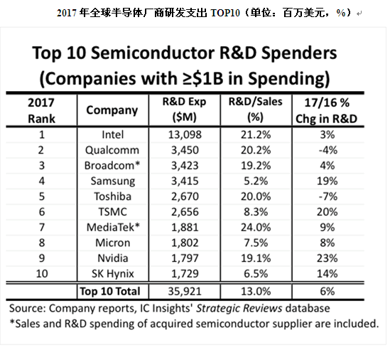 IC Insights表示,2017年全球半导体研发支出总额为589亿美元,报告显示,2017年,研发支出排名前10名的公司支出增加了6%,导致整个半导体行业的研发投入增加了4% 午夜影院免费观看,2017年,排名前10位的研发支出超过359亿美元,超过了剩余其他半导体公司230亿美元的总支出, 。