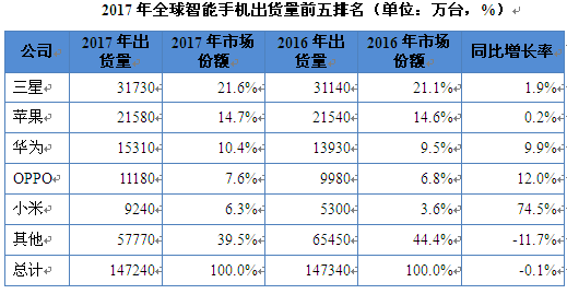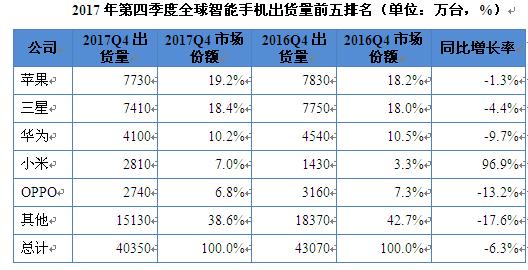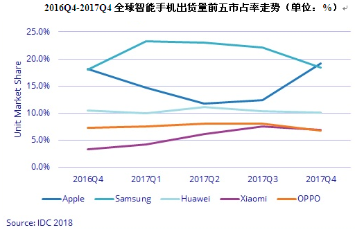 尽管OPPO、vivo等中国厂商竞争激烈,但华为仍继续保持第三名的地位。Q42017华为出货4100万台,较2016年第四季度的4540万台下降了9,7%。对于这家中国巨头来说,2017年的业绩看起来要好得多,荣耀手机帮助推动了中国内外的销售。2017年华为总出货量为1 深夜在线电影,531亿部,较2016年的1,393亿部增长9,9%,Mate系列和Honor子品牌继续在众多市场的销量起着至关重要的推动作用,而Y系列则在低端市场蓬勃发展。最近,由于美国运营商AT&T和Verizon最近纷纷切断了与华为的联系,华为进入美国市场的愿望被搁置。如果华为希望最终推翻苹果(Apple)和三星(Samsung)等市场领头羊的地位,那么通过官方运营商进入美国仍然是至关重要的。 。