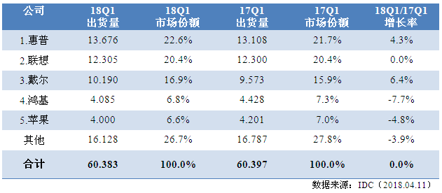 苹果位居第五,一季度PC出货量为400万台,同比下降4.8%,市场份额从去年同期的7.0%降至6.6%。