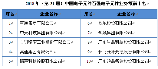 2017年,光电线缆行业龙头企业——亨通集团有限公司凭借远超其余诸强的资产总额和电子元件业务额再次夺冠,实现电子元件百强十连冠的壮举 午夜影视资源,微型电声器件行业的领军企业——瑞声科技控股有限公司以超强的盈利水平位居本届电子元件百强第二名,另一家光电线缆巨头——中天科技集团有限公司屈居第三, 。