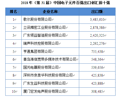从各企业的出口规模看,四家苹果公司的供货商——歌尔股份、立讯精密、领益智造、瑞声科技包揽出口额前四位,三家公司的出口总额已经达到本届电子元件百强出口总额的60%。