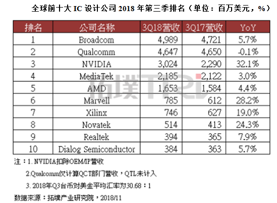 根据拓墣产业研究院最新统计,全球前十大IC设计业者2018年第三季营收及排名出炉,受惠于网通,资料中心,车用领域与消费性电子的成长动能,大多数IC设计业者的营收表现皆较去年同期成长,仅有Qualcomm出现微幅衰退的情况 午夜影院,三家台系设计业者如联发科,联咏与瑞昱等,则受消费性电子的带动,第三季成长表现出色,联发科自第二季开始,已摆脱衰退阴霾,第三季较去年同期成长3%, 。