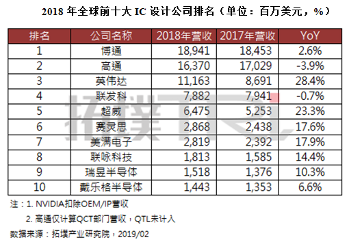 根据拓墣产业研究院最新统计,2018年全球前十大IC设计业者营收排名出炉,前三名依序为博通、高通、英伟达。前十名中,高通因受到智能手机需求疲弱影响,衰退幅度最大,营收较前一年衰退3,9%;联发科同样受智能手机需求不佳冲击,2018年年营收衰退0,7%(以美元计算),然而,若以新台币计算,衰退幅度仅为0,1%。 午夜影院。
