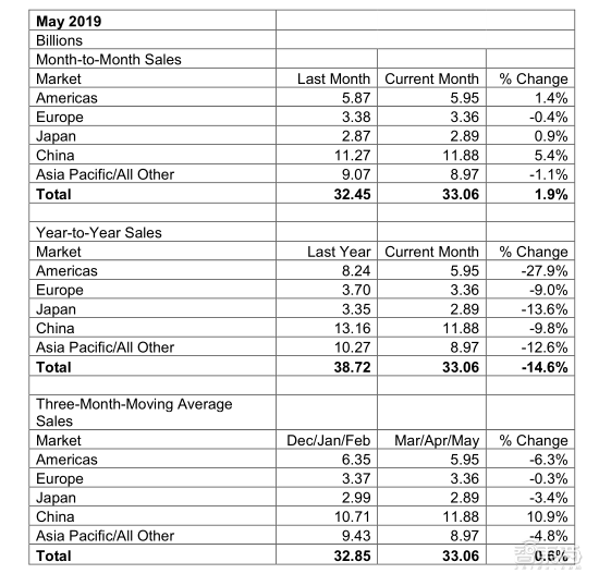 SIA报告显示,就2019年5月半导体销售额来说,同比来看,全球各个地区半导体市场均呈现下滑,美洲地区更是大减27,9%,其余地区的降幅则在9-14%之间;环比来看,美洲、日本及中国的销售额有小幅成长,中国的涨幅最高,达到5,4%,而欧洲与亚太其他地区销售额均出现下滑。 午夜高清播放。