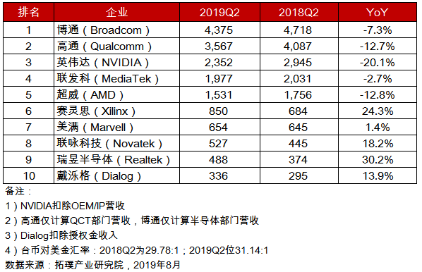 根据集邦咨询旗下拓墣产业研究院最新统计,全球前十大IC设计业者2019年第二季营收排名出炉,受中美贸易战及供应链库存攀升影响,全球消费性电子产品包括智能手机、平板、笔电、液晶监视器、电视与服务器等市场需求皆不如预期,前五名业者第二季营收皆较去年同期衰退,其中英伟达(NVIDIA)衰退幅度最大,达20 午夜影院,1%,这也是英伟达近三年来首见连续三个季度营收呈现年衰退的情况。 。