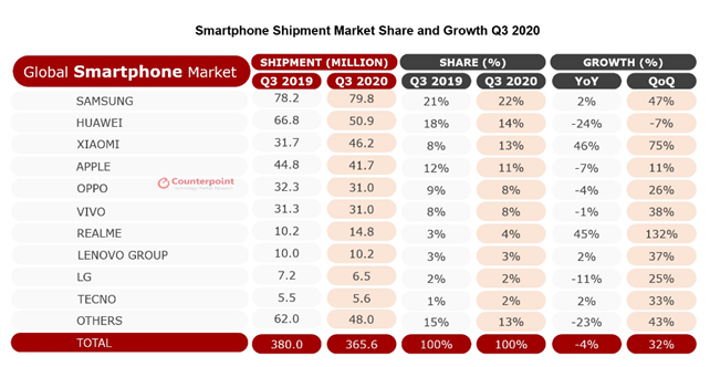 市调机构Counterpoint的最新报告显示,2020年第三季度全球智能手机市场出货量达3 午夜影院,66亿台,环比增长32%。 。