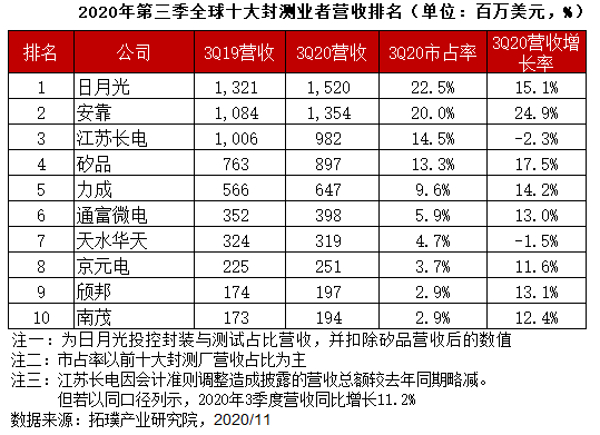 2020年第三季封测龙头日月光(ASE)及安靠(Amkor)营收分别为15,20亿美元与13,54亿美元年成长15,1%及24,9%。第三季营收成长幅度相较第二季略为放缓,然随着5G通讯、WiFi 6及车用芯片的需求上扬与华为急单助力下,整体表现仍相对出色。封测大厂力成(PTI)第三季营收虽然达6,47亿美元,年增14 午夜影院在线观看,2%,然存储器封测需求不如预期,力成逐步开展改革计划,以降低长期对于存储器封装需求的依赖,并出售和关闭其他获利较差的子公司加以应对。 。