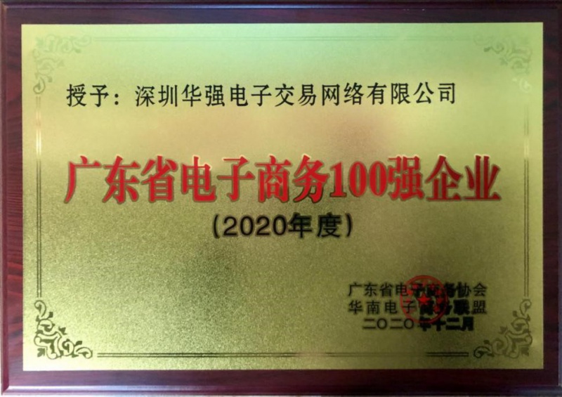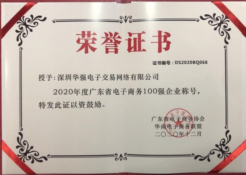 图:深圳华强电子交易网络有限公司荣获广东省电子商务100强企业荣誉证书