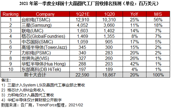 TrendForce集邦咨询旗下半导体研究处表示 午夜影院,2021年第一季全球晶圆代工市场需求依旧旺盛,面对终端产品对芯片的需求居高不下,客户倾向加大拉货力道,使晶圆代工产能供不应求状况延续,因此预估各业者营运表现将持续走强,预估第一季全球前十大晶圆代工业者总营收年成长达20%,其中市占前三大分别为台积电(TSMC),三星(Samsung),联电(UMC),然而,未来需关注晶圆代工厂商重新调配产能供给,在加速生产车用芯片之际,恐间接影响消费电子,工业用等相关芯片的生产与交货时程, 。