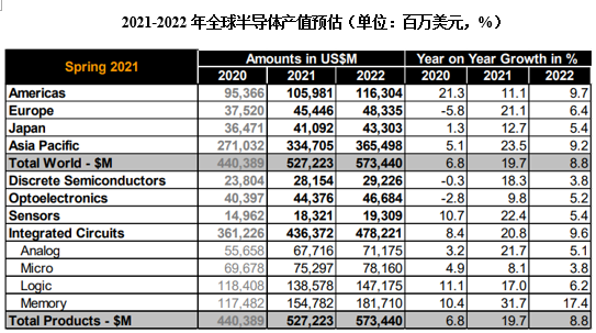 6月8日,世界半导体贸易统计协会(WSTS)发布了截止至2021年5月的最新半导体市场预测报告。WSTS预估,2021年全年全球半导体产值将达5272亿美元,将成长19 午夜影院,7%;存储器产值将成长31,7%,增幅最高,坐稳第一。 。