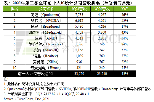 根据TrendForce集邦咨询表示 午夜影院,2021年第三季半导体市场热络,全球前十大IC设计业者总计营收达337亿美元,年增45%,其中,除了联发科(MediaTek),联咏(Novatek),瑞昱(Realtek)原本就列居排行榜中,此次奇景(Himax)也抢进第十名, 。