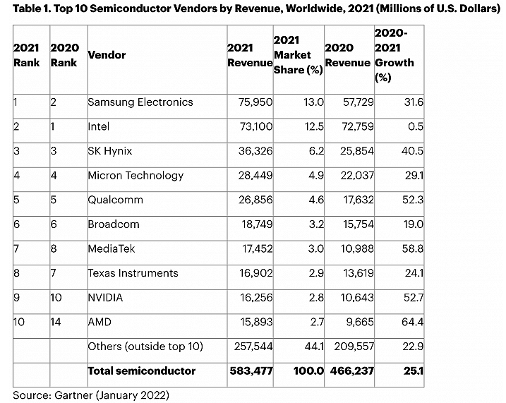 厂商排名方面,三星(Samsung)超过英特尔(Intel),成为顶级芯片销售商。2021年三星的半导体收入激增31,6%,达到759亿美元。该公司上一次排名第一是在2018年。 午夜影视资源。