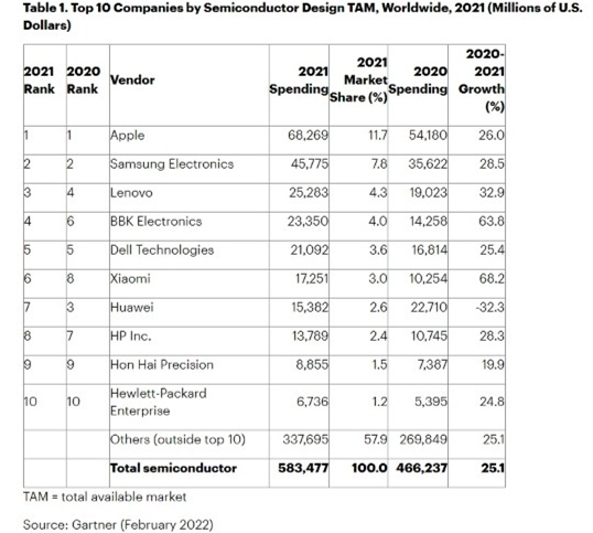 市场研究公司Gartner在2月2日发布了2021全球芯片买家TOP10报告,报告显示2021年IT制造商的半导体采购总额为5834,77亿美元(约3 午夜影院,71万亿元人民币),比上年增长25,1%。 。