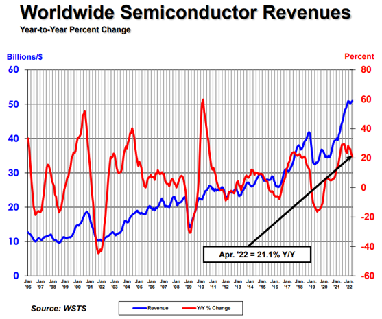 半导体行业协会(SIA)6月6日宣布消息显示,2022年4月,全球半导体行业销售额为509亿美元,比2021年4月的420亿美元增长21,1%,比3月的506亿美元增长0,7%。 午夜影院。