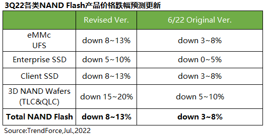 TrendForce集邦咨询表示,由于需求未见好转,NAND Flash产出及制程转进持续,下半年市场供过于求加剧,包含笔电,电视与智能手机等消费性电子下半年旺季不旺已成市场共识,物料库存水位持续攀升成为供应链风险,因渠道库存去化缓慢,客户拉货态度保守,造成库存问题漫溢至上游供应端,卖方承受的抛货压力与日俱增,TrendForce集邦咨询预估,由于供需失衡急速恶化,第三季NAND Flash价格跌幅将扩大至8~13%,且跌势恐将延续至第四季 午夜影院, 。