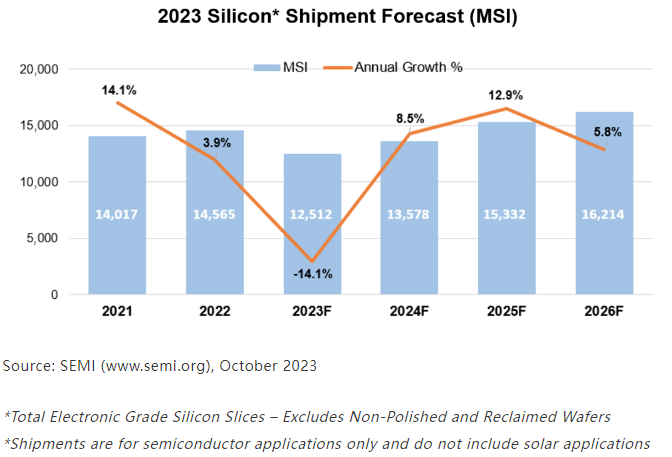 10月26日,国际半导体产业协会SEMI表示,受半导体需求的持续疲软和宏观经济状况影响,2023年全球硅晶圆出货量预计将下降14%。按面积计算,2022年全球晶圆出货量创下历史记录,达到145,65亿平方英寸(MSI),预计2023年将降至125 午夜影院,12亿平方英寸。 。